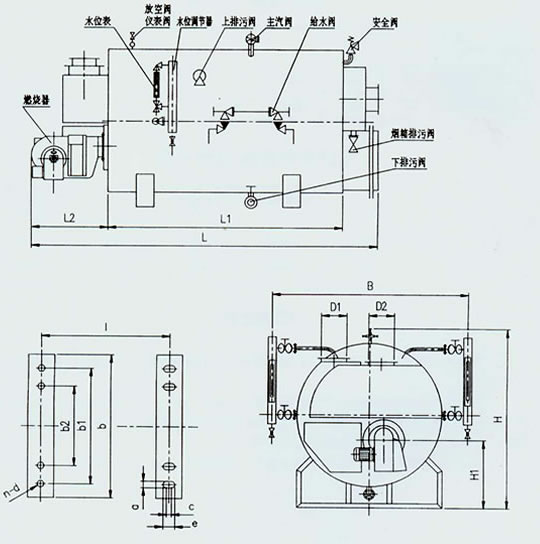 該系列鍋爐為臥式結(jié)構(gòu),其燃油部分的爐膽及煙管管群均布置在鍋殼的下部,其廢氣受熱面的煙管管群一般布置在燃油部分的上部。該結(jié)構(gòu)形式非常便于甲板層間低及尾排氣形式的船舶結(jié)